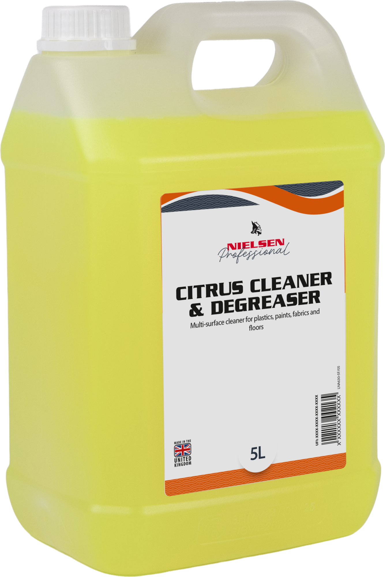Dilute Citrus Cleaner & Degreaser between 1:10 and 1:100 with water depending upon degree of soiling. Apply the product via pressure washer, hand sprayer, cloth, brush or mop. Allow a short contact time, agitating stubborn deposits as required. Rinse thoroughly with clean water or a damp cloth.