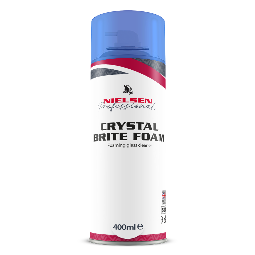 Crystal Brite Foam is the premium foaming window and glass cleaner aerosol, designed to remove finger marks, grease and nicotine from glass surfaces, restoring their original clarity and brilliance. The product sprays a light foam, which clings to the glass, reducing run off and showing exactly where the product has been applied. This reduces consumption and improves economy and time. Unlike some foaming glass cleaners the foam is designed to break down quickly as it is wiped for enhanced ease and speed of use. Crystal Brite Foam’s no smear formula is ideally suited for use on windscreens as well as windows and mirrors in washrooms, offices and homes.